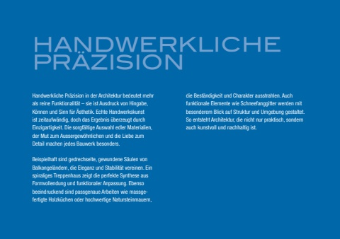 Handwerkliche Pr%u00e4zision in der Architektur bedeutet mehr als reine Funktionalit%u00e4t %u2013 sie ist Ausdruck von Hingabe, K%u00f6nnen und Sinn f%u00fcr %u00c4sthetik. Echte Handwerkskunst ist zeitaufw%u00e4ndig, doch das Ergebnis %u00fcberzeugt durch Einzigartigkeit. Die sorgf%u00e4ltige Auswahl edler Materialien, der Mut zum Aussergew%u00f6hnlichen und die Liebe zum Detail machen jedes Bauwerk besonders.Beispielhaft sind gedrechselte, gewundene S%u00e4ulen von Balkongel%u00e4ndern, die Eleganz und Stabilit%u00e4t vereinen. Ein spiraliges Treppenhaus zeigt die perfekte Synthese aus Formvollendung und funktionaler Anpassung. Ebenso beeindruckend sind passgenaue Arbeiten wie massgefertigte Holzk%u00fcchen oder hochwertige Natursteinmauern, die Best%u00e4ndigkeit und Charakter ausstrahlen. Auch funktionale Elemente wie Schneefanggitter werden mit besonderem Blick auf Struktur und Umgebung gestaltet. So entsteht Architektur, die nicht nur praktisch, sondern auch kunstvoll und nachhaltig ist.HANDWERKLICHE PR%u00c4ZISION