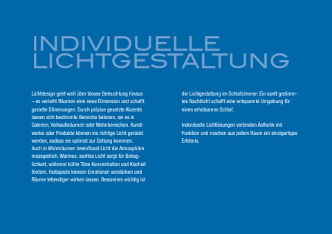 Lichtdesign geht weit %u00fcber blosse Beleuchtung hinaus %u2013 es verleiht R%u00e4umen eine neue Dimension und schafft gezielte Stimmungen. Durch pr%u00e4zise gesetzte Akzente lassen sich bestimmte Bereiche betonen, sei es in Galerien, Verkaufsr%u00e4umen oder Wohnbereichen. Kunstwerke oder Produkte k%u00f6nnen ins richtige Licht ger%u00fcckt werden, sodass sie optimal zur Geltung kommen.Auch in Wohnr%u00e4umen beeinfl usst Licht die Atmosph%u00e4re massgeblich. Warmes, sanftes Licht sorgt f%u00fcr Behaglichkeit, w%u00e4hrend k%u00fchle T%u00f6ne Konzentration und Klarheit f%u00f6rdern. Farbspiele k%u00f6nnen Emotionen verst%u00e4rken und R%u00e4ume lebendiger wirken lassen. Besonders wichtig ist die Lichtgestaltung im Schlafzimmer: Ein sanft gedimmtes Nachtlicht schafft eine entspannte Umgebung f%u00fcr einen erholsamen Schlaf.Individuelle Lichtl%u00f6sungen verbinden %u00c4sthetik mit Funktion und machen aus jedem Raum ein einzigartiges Erlebnis.INDIVIDUELLE LICHTGESTALTUNG