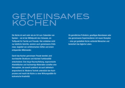 Die K%u00fcche ist weit mehr als ein Ort zum Zubereiten von Speisen %u2013 sie ist der Mittelpunkt des Zuhauses, ein Treffpunkt f%u00fcr Familie und Freunde. Hier entstehen nicht nur k%u00f6stliche Gerichte, sondern auch gemeinsame Erlebnisse, begleitet von verf%u00fchrerischen D%u00fcften und einem entspannten Miteinander.Damit das Kochen gemeinsam Freude bereitet, sind durchdachte Strukturen und h%u00f6chste Funktionalit%u00e4t entscheidend. Eine kluge Raumaufteilung, ergonomische Arbeitsfl %u00e4chen und hochwertige Materialien schaffen eine Atmosph%u00e4re, die sowohl praktisch als auch %u00e4sthetisch ansprechend ist. Moderne Technik unterst%u00fctzt den Kochprozess und macht die K%u00fcche zu einer Wirkungsst%u00e4tte f%u00fcr kulinarische Kreativit%u00e4t.Ob gem%u00fctliches Fr%u00fchst%u00fcck, geselliges Abendessen oder das gemeinsame Experimentieren mit neuen Rezepten %u2013 eine gut gestaltete K%u00fcche verbindet Menschen und bereichert das t%u00e4gliche Leben.GEMEINSAMES KOCHEN