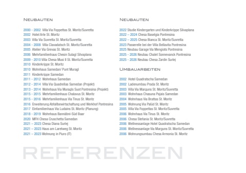 Neubauten2022 Studie Kindergarten und Kinderkrippe Silvaplana2022 %u2013 2024 Chesa Baselgia Pontresina2022 %u2013 2025 Chesa Bianca St. Moritz/Suvretta2023 Passerelle bei der Villa Bellavita Pontresina2025 Neubau Garage Via Mengiots Pontresina2025 - 2026 Neubau Chalet Sonnevanck Pontresina2025 - 2026 Neubau Chesa Zardin SurlejUmbauarbeiten2002 Hotel Quadratscha Samedan2002 Ladenumbau Prada St. Moritz2003 Villa Via Marguns St. Moritz/Suvretta2003 Wohnhaus Chasuna Pajais Samedan2004 Wohnhaus Via Brattas St. Moritz2005 Wohnung Via Pal%u00fcd St. Moritz2005 Villa Via Foppettas St. Moritz/Suvretta2006 Wohnhaus Via Tinus St. Moritz2006 Chesa Stefania St. Moritz/Suvretta2006 Wellnessanlage Hotel Quadratscha Samedan2006 Wellnessanlage Via Marguns St. Moritz/Suvretta2006 Wohnungsumbau Chesa Armonia St. MoritzreferenzenNeubauten2000 - 2002 Villa Via Foppettas St. Moritz/Suvretta2002 Hotel Arte St. Moritz2003 Villa Via Suvretta St. Moritz/Suvretta2004 - 2008 Villa Clavadatsch St. Moritz/Suvretta2005 Atelier Via Grevas St. Moritz2006 Mehrfamilienhaus Chesin Sulagl Silvaplana2009 - 2010 Villa Chesa Musi II St. Moritz/Suvretta2010 Kinderkrippe St. Moritz2010 Wohnhaus Samedan/ Punt Muragl2011 Kinderkrippe Samedan2011 - 2012 Wohnhaus Samedan2012 - 2014 Villa Via Quadrellas Samedan (Projekt)2013 - 2014 Wohnhaus Via Muragls Suot Pontresina (Projekt)2015 - 2015 Mehrfamilienhaus Chalavus St. Moritz2015 - 2016 Mehrfamilienhaus Via Tinus St. Moritz2016 Erweiterung Abfallbewirtschaftung und Werkhof Pontresina 2017 Einfamilienhaus Via Ludains St. Moritz (Planung)2018 - 2019 Wohnhaus Bann%u00e4bni-S%u00fcd Baar2020 MFH Chesa Cruschetta Samedan 2021 %u2013 2023 Chesa Diana Surlej2021 %u2013 2023 Haus am Laretweg St. Moritz2021 %u2013 2023 Wohnung in Piuro (IT)
