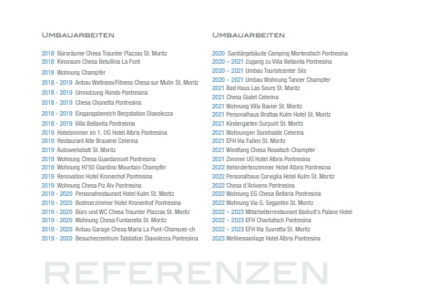Umbauarbeiten2020 Sanit%u00e4rgeb%u00e4ude Camping Morteratsch Pontresina2020 %u2013 2021 Zugang zu Villa Bellavita Pontresina2020 %u2013 2021 Umbau Touristcenter Sils2020 %u2013 2021 Umbau Wohnung Tanner Champfer2021 Bad Haus Las Sours St. Moritz2021 Chesa Gialet Celerina2021 Wohnung Villa Bavier St. Moritz2021 Personalhaus Brattas Kulm Hotel St. Moritz2021 Kindergarten Surpunt St. Moritz2021 Wohnungen Sonnhalde Celerina2021 EFH Via Fallen St. Moritz2021 Windfang Chesa Rosatsch Champfer2021 Zimmer UG Hotel Albris Pontresina2022 Behindertenzimmer Hotel Albris Pontresina2022 Personalhaus Corviglia Hotel Kulm St. Moritz2022 Chesa d%u2019Ar%u00f6vens Pontresina2022 Wohnung EG Chesa Bellaria Pontresina2022 Wohnung Via G. Segantini St. Moritz2022 %u2013 2023 Mitarbeiterrestaurant Badrutt%u2019s Palace Hotel 2022 %u2013 2023 EFH Chantatsch Pontresina2022 %u2013 2023 EFH Via Suvretta St. Moritz2023 Wellnessanlage Hotel Albris PontresinaUmbauarbeiten2018 B%u00fcror%u00e4ume Chesa Traunter Plazzas St. Moritz2018 Kinoraum Chesa Betullina La Punt2018 Wohnung Champf%u00e8r 2018 - 2019 Anbau Wellness/Fitness Chesa sur Mulin St. Moritz2018 - 2019 Umnutzung Rondo Pontresina2018 - 2019 Chesa Ch%u00fcnetta Pontresina2018 - 2019 Eingangsbereich Bergstation Diavolezza2018 - 2019 Villa Bellavita Pontresina2019 Hotelzimmer im 1. OG Hotel Albris Pontresina2019 Restaurant Alte Brauerei Celerina2019 Autowerkstatt St. Moritz2019 Wohnung Chesa Guardamunt Pontresina2019 Wohnung H750 Giardino Mountain Champf%u00e8r2019 Renovation Hotel Kronenhof Pontresina2019 Wohnung Chesa Piz Alv Pontresina2019 - 2020 Personalrestaurant Hotel Kulm St. Moritz2019 - 2020 Bodmerzimmer Hotel Kronenhof Pontresina2019 - 2020 B%u00fcro und WC Chesa Traunter Plazzas St. Moritz2019 - 2020 Wohnung Chesa Funtanella St. Moritz2019 - 2020 Anbau Garage Chesa Maria La Punt-Chamues-ch2019 - 2020 Besucherzentrum Talstation Diavolezza Pontresinareferenzen