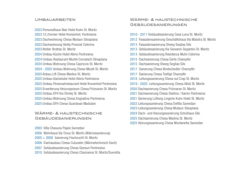 Umbauarbeiten2023 Personalhaus Nair Hotel Kulm St. Moritz2023 10 Zimmer Hotel Kronenhof, Pontresina2023 Dachwohnung Chesa Mutaun Silvaplana2023 Dachwohnung Vietta Provizel Celerina2023 Atelier Brattas St. Moritz2024 Umbau K%u00fcche Hotel Albris Pontresina2024 Umbau Restaurant Murt%u00e8l Corvatsch Silvaplana2024 Umbau Wohnung Chesa Capriccio St. Moritz2024 - 2025 Umbau Wohnung Chesa Mezdi St. Moritz2025 Anbau Lift Chesa Madina St. Moritz2025 Umbau Backstube Hotel Albris Pontresina2025 Umbau Personalrestaurant Hotel Kronenhof Pontresina2025 Erweiterung Heizungsraum Chesa Pr%u00fcmaran St. Moritz2025 Umbau EFH Via Dimlej St. Moritz2025 Umbau Wohnung Chesa Engiadina Pontresina2025 Umbau EFH Chesa Guardaval MadulainW%u00e4rme- & haustechnische Geb%u00e4udesanierungen2003 Villa Chasuna Pajais Samedan2006 Wohnhaus Via Tinus St. Moritz (W%u00e4rmesanierung)2005 + 2008 Sanierung Fischzucht St. Moritz2006 Dachausbau Chesa Culuoster (W%u00e4rmetechnisch Dach)2007 Geb%u00e4udesanierung Chesa Giarsun Pontresina2010 Geb%u00e4udesanierung Chesa Chamanna St. Moritz/SuvrettaW%u00e4rme- & haustechnische Geb%u00e4udesanierungen2010 - 2011 Geb%u00e4udesanierung Casa Luna St. Moritz2012 Fassadensanierung Gesch%u00e4ftshaus Via Maistra St. Moritz2013 Fassadensanierung Stweg Seglias Sils2013 Geb%u00e4udesanierung Via Giovanni Segantini St. Moritz2013 Geb%u00e4udesanierung Residenza Mulin Celerina2015 Dachsanierung Chesa %u00dcerts Champf%u00e8r2015 Dachsanierung Stweg Seglias Sils2017 Sanierung Chesa Bindschedler Champf%u00e8r 2017 Sanierung Chesa Traf%u00f6gl Champf%u00e8r2018 Leitungssanierung Chesa sul Crap St. Moritz 2019 - 2020 Leitungssanierung Chesa Allod St. Moritz 2020 Dachsanierung Chesa Pr%u00fcmaran St. Moritz2021 Dachsanierung Chesa Stailina / Sainin Pontresina2021 Sanierung L%u00fcftung Lingerie Kulm Hotel St. Moritz2022 Leitungssanierung Chesa Defi lla Samedan2023 Leitungssanierung Chesa Mutaun Silvaplana2024 Dach- und Heizungssanierung Schulhaus Sils2025 Dachsanierung Chesa Madina St. Moritz2025 Heizungssanierung Chesa Muntanella Samedan